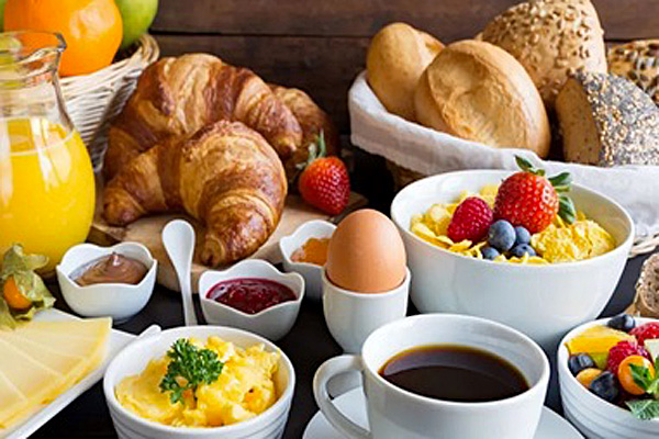 Verse broodjes, koffiekoekjes, brood, confituur, choco, boter, roerei of spiegelei met of zonder spek, diverse soorten beleg, yoghurt, fruitsap, 2 koffie of thee (andere dranken mogelijk mits supplement)